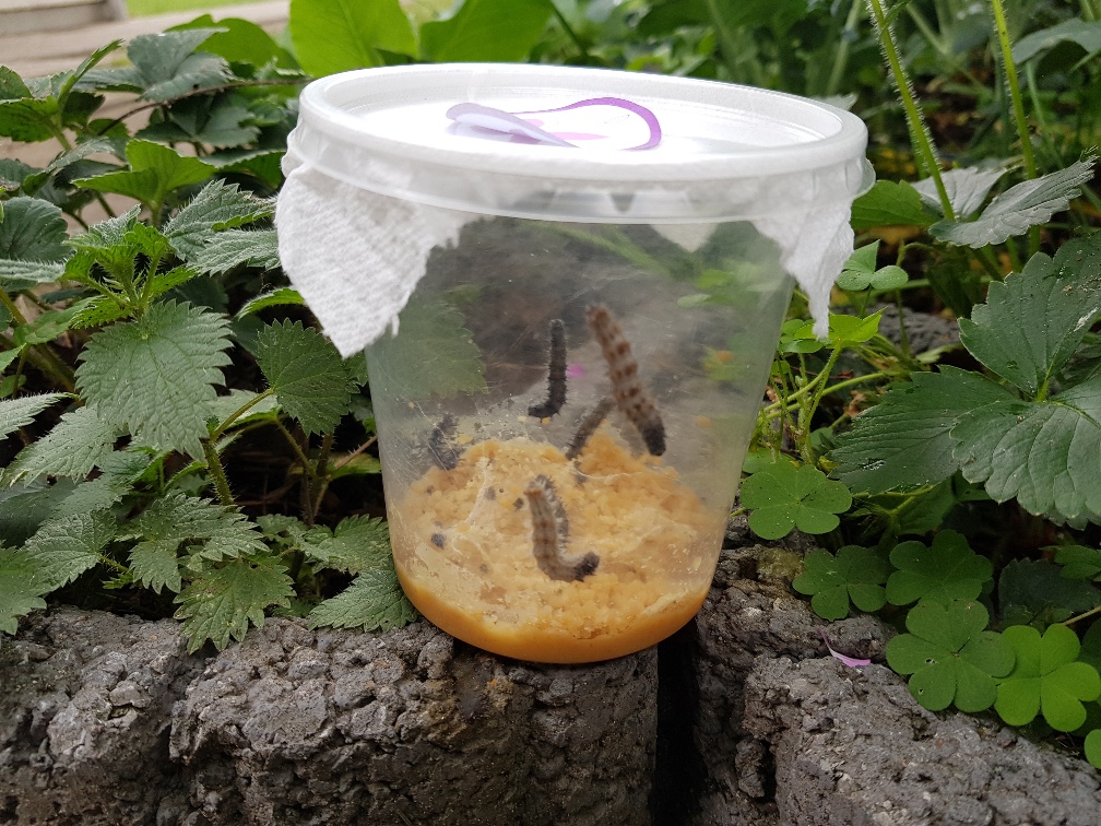 - Aufzucht der Raupen (des Distelfalters) im Becher mit Nährlösung